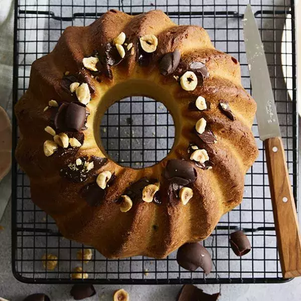 Démoulez la brioche et parsemer de copeaux de chocolat quand la pâte est encore chaude afin que le chocolat fonde. Parsemez de noisettes.