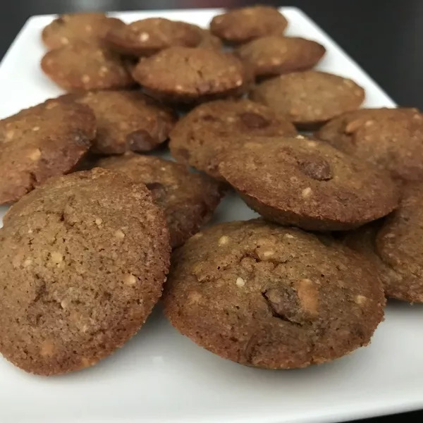 🍪Ajouter l'œuf, mélanger. Puis ajouter la farine et la levure tamisées. Et enfin les pépites de chocolat et le pralin.
