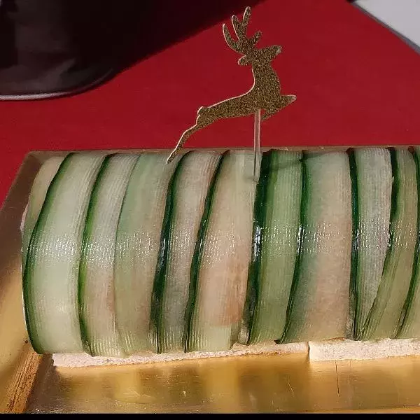 Décorer la bûche savarin selon vos goûts avec du fromage frais, des tranches de saumon fumé, des baies roses, de l'aneth...... et laisser tranquillement décongeler au réfrigérateur.