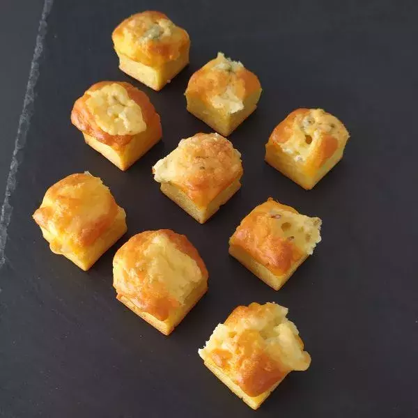 Écrasez le bleu d'Auvergne et coupez la mimolette en petits morceaux.