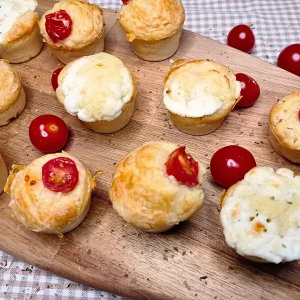 Garnissez les 8 empreintes du moule. Vous pouvez ajouter des tomates cerise sur le dessus de la préparation.