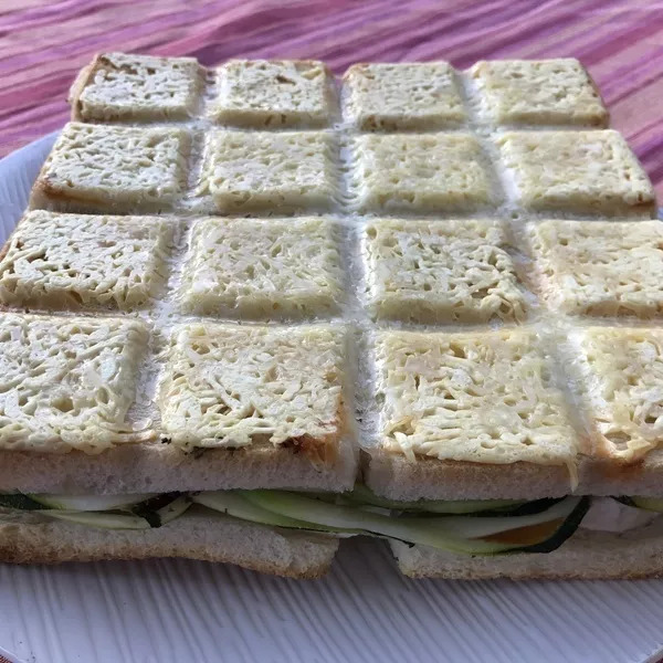 D'abord tapissez votre moule de fromage râpé, puis disposer les 4 tranches de pain de mie