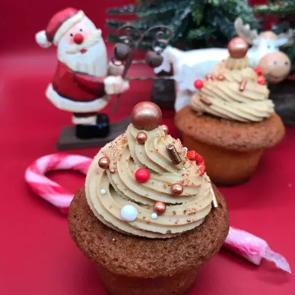Découper un cône en creusant le dessus d'un muffins. Remplir le trou de marmelade ou confiture et retourner par dessus le petit cône. Monter un serpentin sur le pourtour du cône.