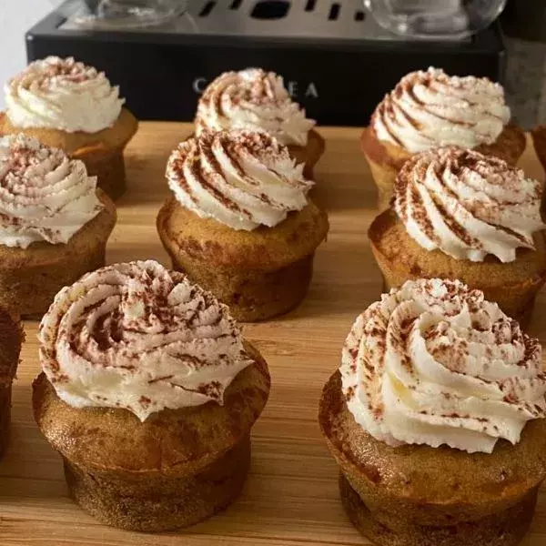 Dans un cul-de-poule, fouetter le beurre mou avec le sucre pour obtenir un mélange crémeux. Rajouter le fromage blanc puis les œufs et mélanger. Ajouter la farine, la levure, la poudre d’amandes, le sel et l’extrait de café. Ajouter enfin le café rhum et fouetter énergiquement pour obtenir un mélange homogène. Garnir vos empreintes et enfourner pour 18-20 mn en recouvrant de la toile de cuisson. Démouler et refroidir sur la grille ronde.