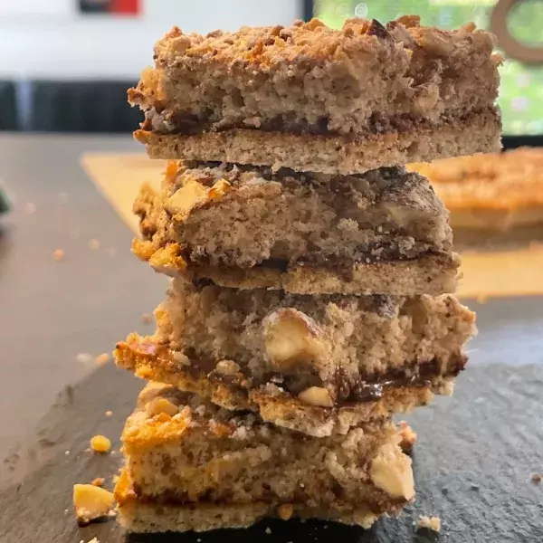 Préchauffez votre four à 180°C (th. 6) et placez votre sur une plaque perforée. Tamisez ensemble la poudre de noisettes, la poudre d'amandes et le sucre glace. Montez les blancs d'oeufs en neige en incorporant le sucre dès que les blancs commencent à mousser. Incorporez le mélange tamisé aux blancs montés et mélangez délicatement à la spatule. Versez la préparation sur le puis étalez à la spatule coudée. Parsemez la moitié de la dacquoise d'éclats de noisettes et saupoudrez avec du sucre glace. Faites cuire 20 minutes à 180°C (th. 6). Démoulez après refroidissement. Détaillez la dacquoise en 16 rectangles. A la poche à douilles munie de la grosse douille, dressez la pâte à tartiner sur le côté lisse puis recouvrez avec l'autre moitié de la dacquoise.