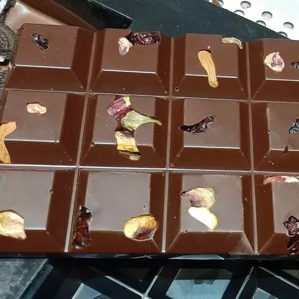 Racler avec la petite spatule coudée pour étaler le chocolat, taper la plaque délicatement sur le plan de travail et laisser figer 5 mn à température ambiante.