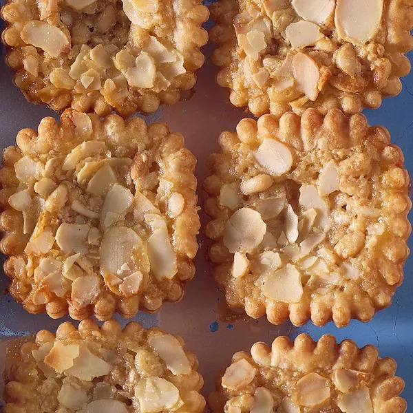 Dans un cul-de-poule, mélangez au fouet le sucre et la crème fraîche jusqu'à ce que le mélange soit homogène. Répartissez la préparation puis les pignons de pin et les amandes effilées dans les empreintes. Faites cuire 18 à 20 minutes à 170°C (th. 6). Démoulez 5 minutes après la sortie du four.