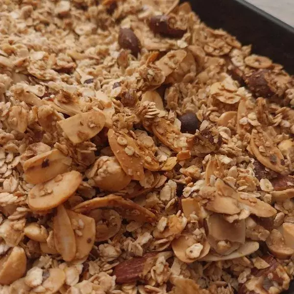 Étape 1 Préchauffer le four à 160°C chaleur tournante. Concasser grossièrement les amandes, et les noix de macadamia, sur la grande planche à découper flexible Guy Demarle. Dans un saladier, verser les flocons d'avoine, la cannelle, les amandes et les noix concassées, puis mélanger avec la spatule double embout. Ajouter le jus de pomme, et l'huile, puis bien mélanger à nouveau. Etaler la préparation sur la , puis enfourner 30 min, en remuant le mélange avec la spatule double embout toute les 10 min environ. Le mélange doit avoir une belle coloration à la sortie du four. Laisser complétement refroidir, puis ajouter les pépites de chocolat. Conserver dans un pot hermétique ou sous be save.