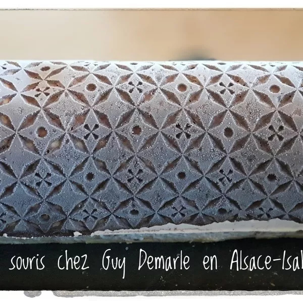 Détaillez la partie décorée de la génoise, la badigeonner avec un sirop de sucre de canne ou du jus d’orange . et placez la dans le moule à bûche. Imbibez également les autres morceaux de génoise .