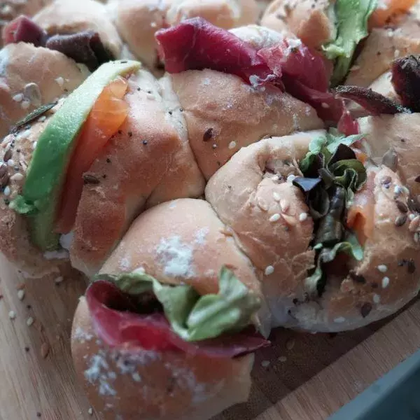 Ouvrez 12 pains en portefeuille. Tartinez un côté avec le mélange oeuf/thon/mayonnaise. Placez 1/2 cœur de salade, ½ tomate et quelques rondelles d’oignon et d’olives vertes. Terminez par les graines de sésame.