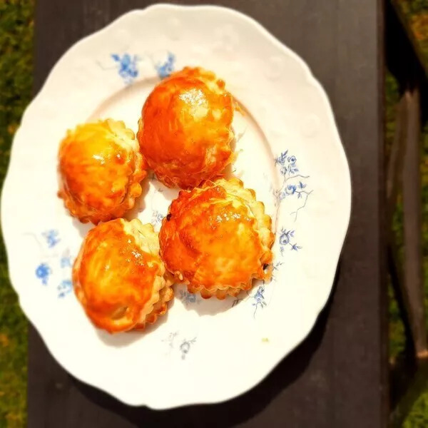 Découper des ronds de pâte feuilletée avec le découpoir 5 cm et placer un rond de pâte dans chaque empreinte en essayant de l'enfoncer légèrement sur le bord.