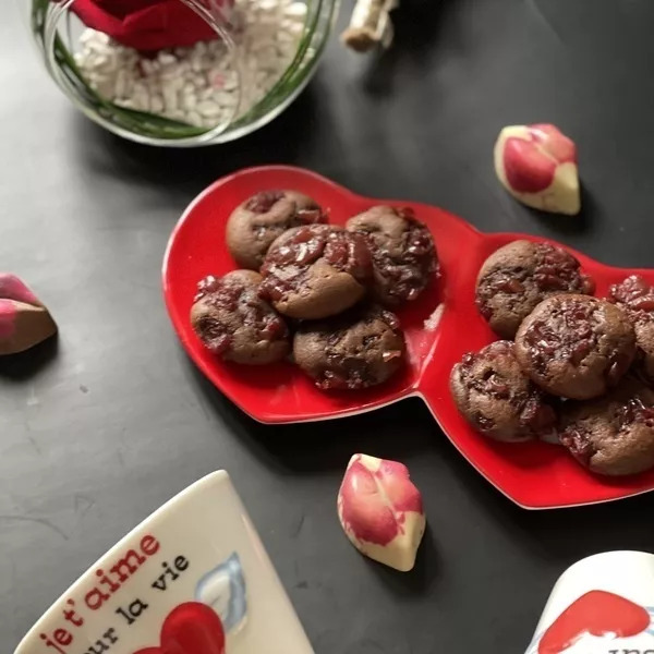 Répartir la compotée de cerises dans les empreintes (environ une petite cuillère) et couvrir avec le reste de pâte au chocolat.