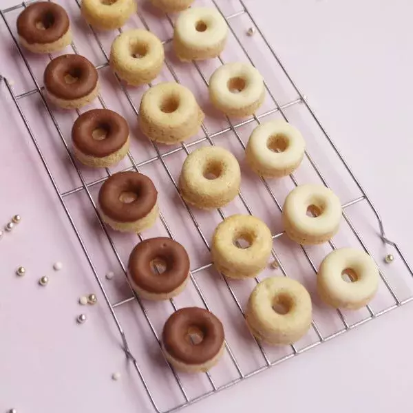 Mettre la pâte précédente dans les empreintes donuts (ou autre) et repartir les groseilles ( ou autres fruits rouges) ainsi que le chocolat blanc dans les moules.