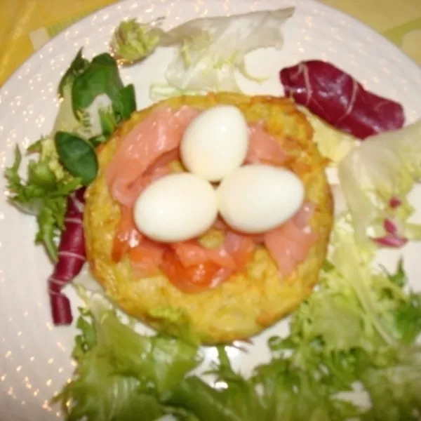 Enfournez 20 minutes à 200°, au bout des 20 minutes, ajoutez les œufs de caille dans le centre puis remettre 5 minutes au four.