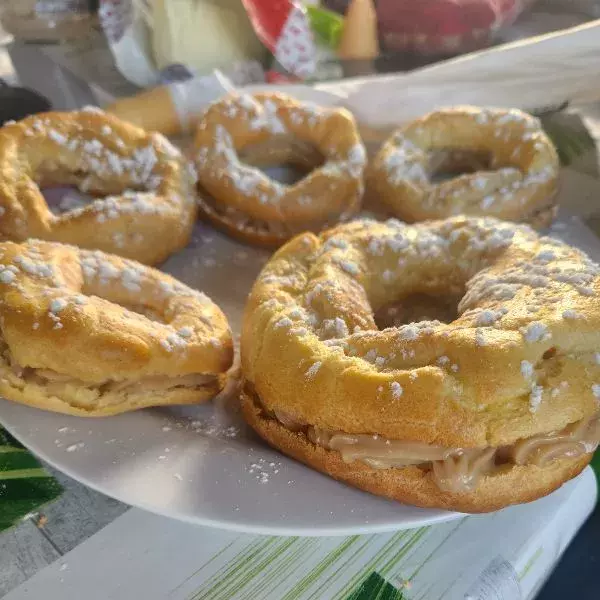 Garnir la base de la couronne de la crème praliné, refermer la couronne et la saupoudrer d'une fine couche de sucre glace à l'aide de la saupoudreuse.
