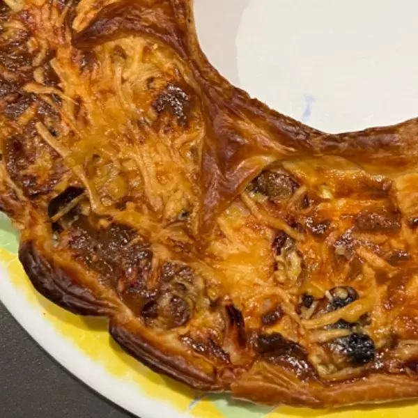 Sur le côté plat d'une moitié, disposez une demie tranche de fromage à raclette, une tranche de bacon pliée en deux, puis de nouveau une demi tranche de fromage.