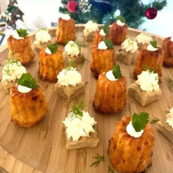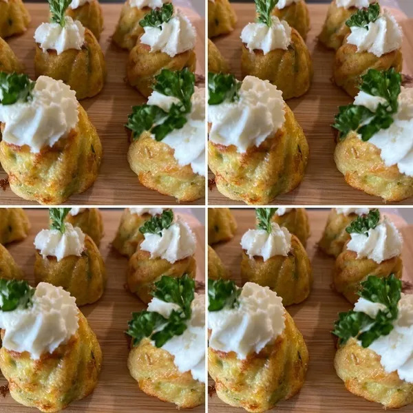 Préchauffer le four à 180 degrés et poser les empreintes sur la plaque aluminium perforée. Dans le cul de poule, mélanger au fouet, la farine, la levure et les œufs. Ajouter le fromage râpé et la crème, bien mélanger. Couper la 1⁄2 courgette en tout petits cubes, émincer l’oignon et émietter le thon, saler et poivrer. Incorporer à la pâte. Répartir dans les empreintes et enfourner pour 15 minutes en prenant soin de poser une toile par dessus. A la sortie du four, démouler et laisser refroidir, puis décorer à la poche à douille, avec le fromage Mme Loïk et de l'aneth. L'autre recette en photo, est celle des mini-cannelés au chorizo avec le moule 30 mini-cannelés, également sur le Club sous mon nom.