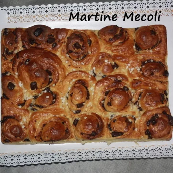 ETAPE 5 Laissez doubler votre pâton de volume vous pouvez le déposer dans une chambre de pousse, dans un cul de poule, protégé d'un torchon sec et propre ou le laisser pousser directement dans le bol de votre robot si vous n'en n"avez pas besoin pour une autre préparation. Une fois votre pâton ayant bien gonflé, dégazez le et façonnez vos petits pains au lait chocolaté en 14 pâtons de 60 g chacun. Glissez 1 voire 2 bâtons de chocolat pâtissier et laissez pousser encore minimum 30 min à température ambiante. Préchauffez votre four à 180°C Dorez vos petits pains façon PITCH avec un jaune d'oeuf et un peu de lait ou de crème fraiche liquide, grignez-les à l'aide de l'incisette ou d'un petit couteau et enfournez pour 20 à 25 min selon votre four et votre souhait de dorure. Une fois cuits, patientez 5 min avant de les démouler sur une grille. Vous pouvez les conserver dans un sac en coton, mis sous vide avec le BE SAVE ou attendre qu'ils aient refroidis pour les congeler à plat dans un sac congélateur. Avec le reste de pâte, soit vous pouvez confectionner d'autres petits pains natures ou sucrés ou faire une tresse et la rouler sur elle-même comme sur ma photo et la faire cuire directement sur votre toile de cuisson ou SILPAIN. Régalez-vous avec ces petits pains extrèmement moelleux.