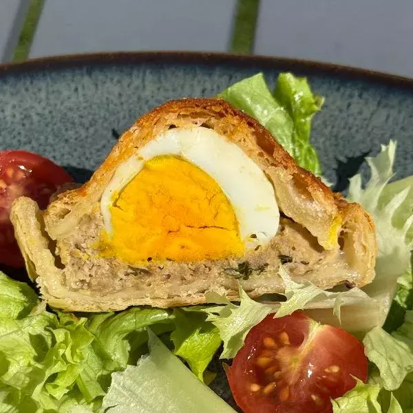 déposez 1 cuillère de mélange de viande, puis 1/2 oeuf, et couvrir avec de la pâte et dorez à l’oeuf.