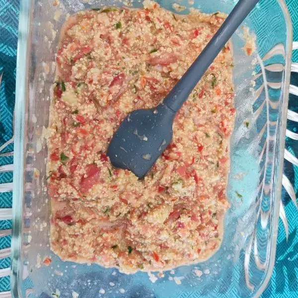 ajoutez la préparation pâte à pizza, l’eau tiède, l’huile d’olive et travaillez la pâte pendant 5 bonnes minutes, couvrir avec un film alimentaire et