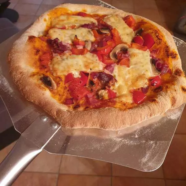 Séparez votre pâton de pâte à pizza en 2. Façonnez votre pizza sur la roul'pat en mettant 1c à soupe de semoule de blé fine et de la farine . Garnissez selon vos envies. Levez un peu la pâte et glissez d'un coup sec la pizza sur la pelle farinée. Déposez- la sur la pierre et faites cuire 7 minutes. Renouvelez l'opération.