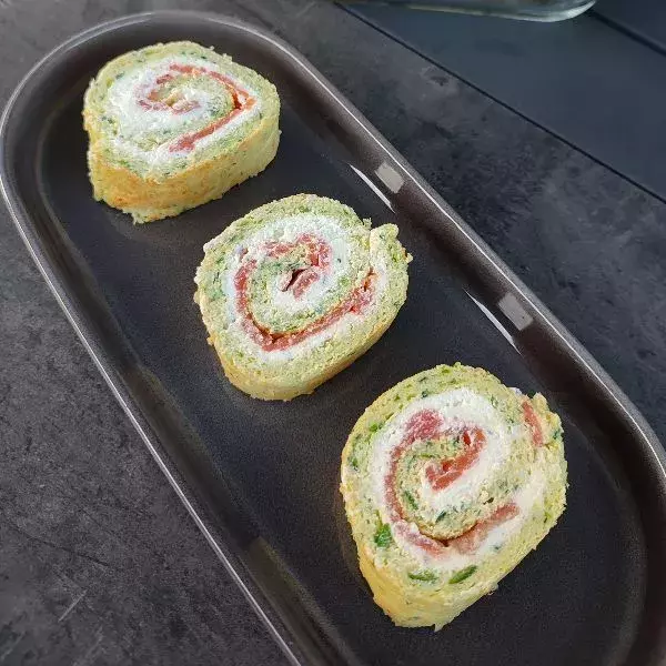 Fait ce jour pour demain mais le roulé se tient très mal.je l’ai emballé dans un film et au frais jusqu’à demain en espérant qu’il aura ´durci ´ et se tiendra bien lors du découpage !🙏 sinon catastrophe pour mon repas de demain 😢