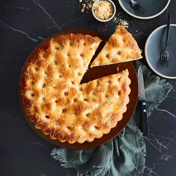 Étalez 600 g de pâte à brioche en un disque de 28 cm de diamètre sur le tapis de pâtisserie gradué. Placez le disque de pâte dans le moule tarte cannelée, préalablement posé sur une plaque perforée et laissez pousser pendant 1 h 30 minutes sous un linge.