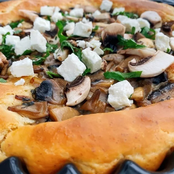 A la sortie du four, répartissez harmonieusement les champignons, le persil, le thym et le roquefort coupé en petits morceaux.