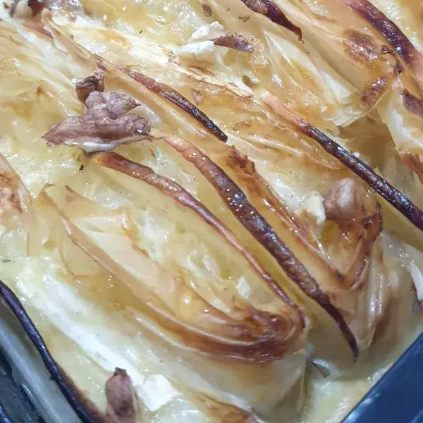 A la sortie du four, parsemez de noix et versez un filet de miel. Je ferais une salade verte avec le mélange échalotes et fruits secs en accompagnement.