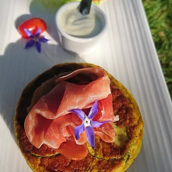 A la sortie du four, déposer une demi-tranche de jambon cru sur chaque part sans noisettes.