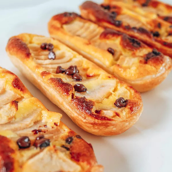 Épluchez les poires, coupez les en deux, videz l’intérieur, coupez les en morceaux et disposez les sur la pâte.