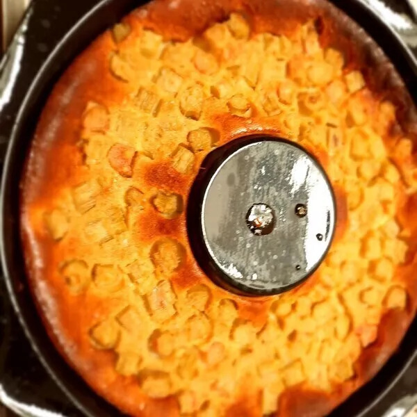 Déposer de la compotée de rhubarbes puis verser la préparation à la crème.