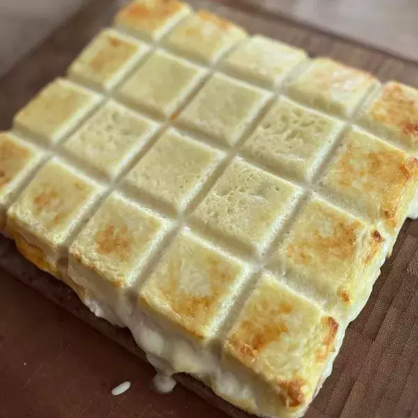 Dans le pichet verseur, mélanger avec la cuillère magique les œufs, la crème, le sel et le poivre. Partager dans chaque empreinte et poser dessus une tranche de pain de mie coupée avec le découpoir.